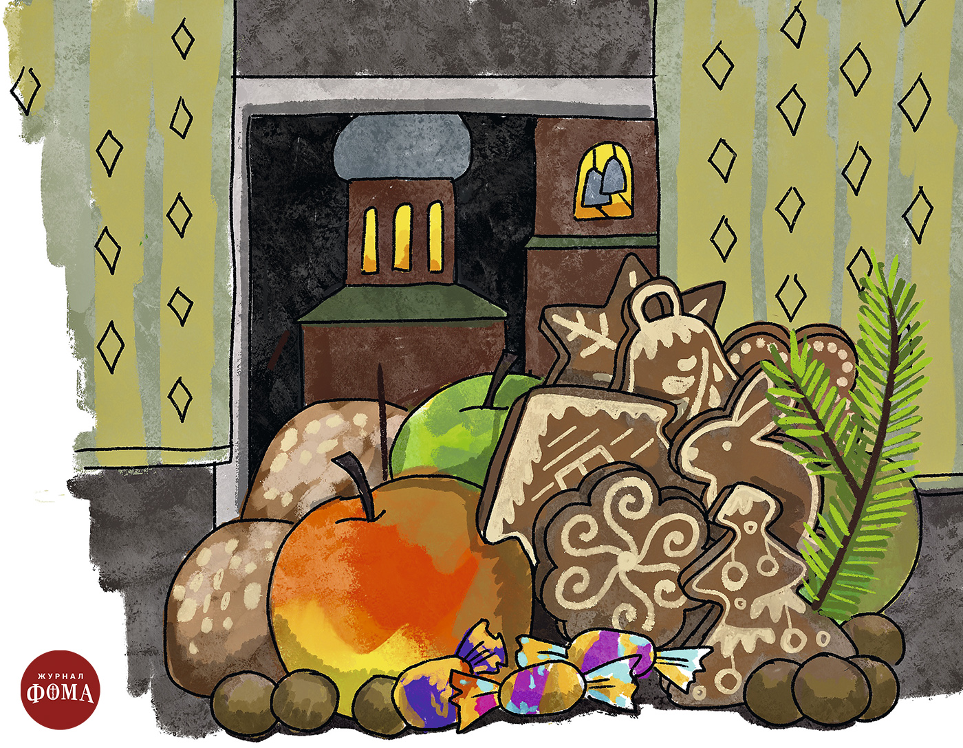 Да, это он! В шелковой рясе, с большим золотым крестом на груди, с тщательно расчёсанными серебряными волосами… В руках — деревянный поднос. А на подносе — целая гора пряников, пастилы, орехов, яблок… Роскошное новогоднее угощение! Просто чудо!