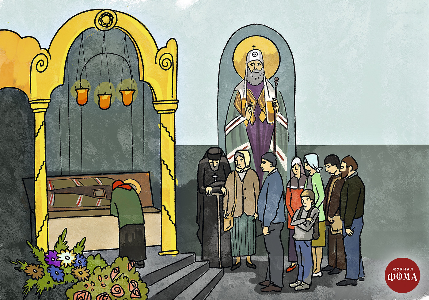 …Под стенами Донского монастыря собралась толпа. Люди стоят, молчат и ждут. Кто-то поглядывает на часы: полдень! Взгляды всех устремляются вверх, на небольшую площадку на монастырской стене. Там появляется худощавая фигура святителя Тихона. Толпа оживляется, но при этом никто не произносит ни звука. Слышно лишь маленьких детей, которые гулят и хнычут на руках у матерей.
